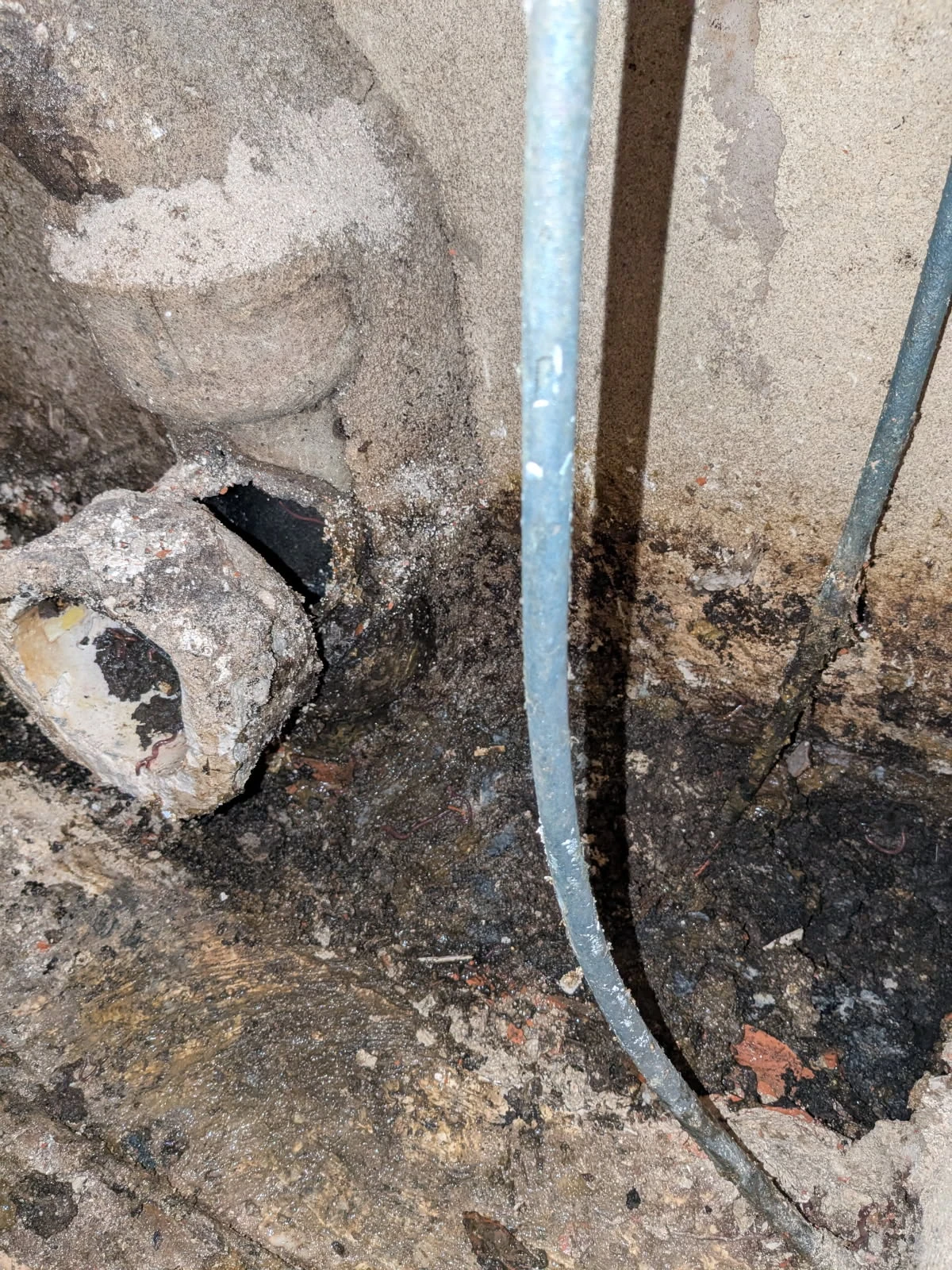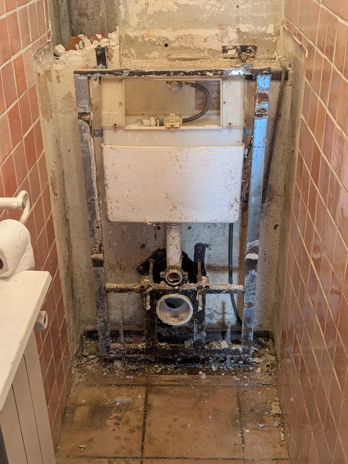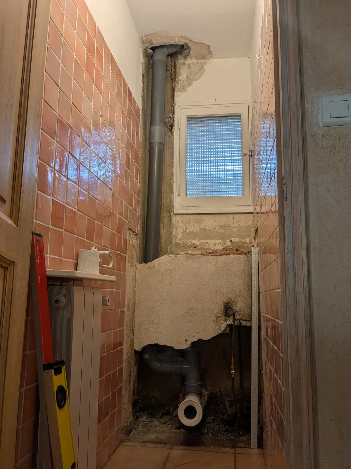 Réfection totale d'une chute PVC fuyarde dans une villa. Dépose du coffrage et du WC suspendu au rez-de-chaussée. Remplacement de la chute, réalisation d'un nouveau coffrage et repose d'un nouveau WC au sol.